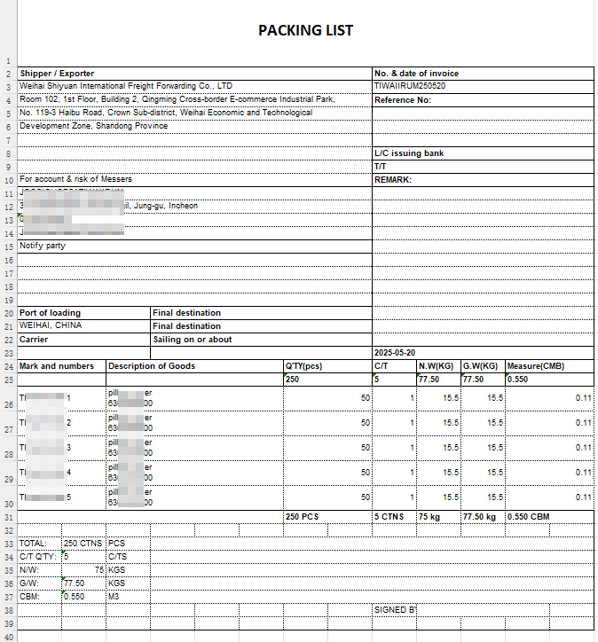 3. Packing List ➡️ B/L 검토 시 참고